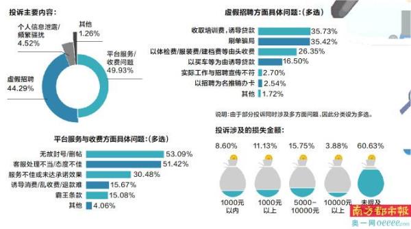 关于网络招聘投诉主要集中在哪些问题?数据分析显示,网络招聘平台服务与收费、虚假招聘两方面问题占绝对比重,比例分别为49.93%、44.29%;个人信息泄露或频繁骚扰问题占4.52%。