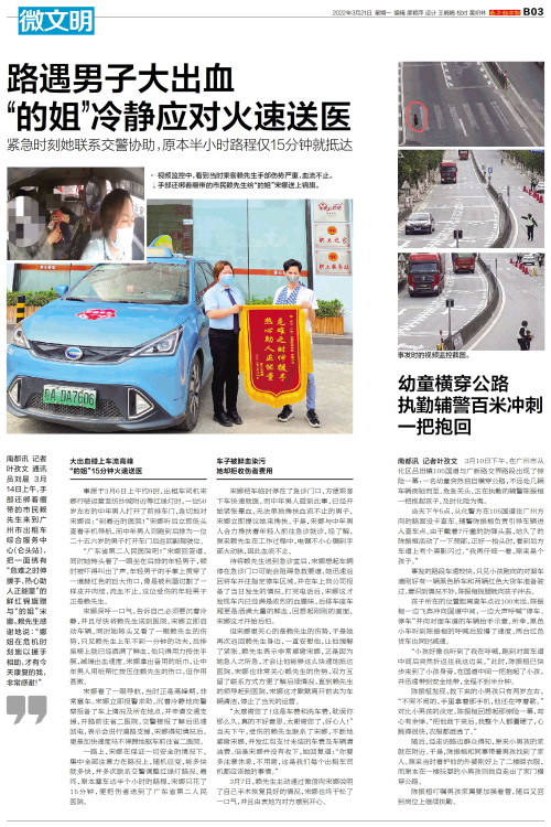 南都讯 记者叶孜文 3月10日下午,在广州市从化区吕田镇105国道与广新路交界路段出现了惊险一幕:一名幼童突然独自横穿公路,不远处几辆车辆疾驰而至。危急关头,正在执勤的辅警陈振桓一把抱起孩子,及时