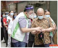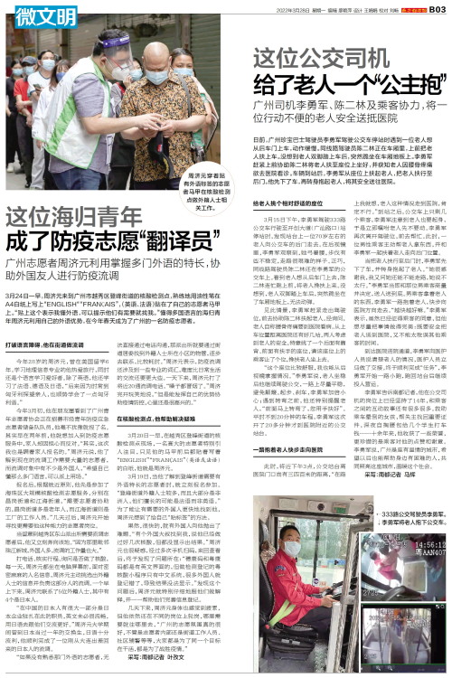 3月24日一早,周济元来到广州市越秀区登峰街道的核酸检测点,熟练地用油性笔在A4白纸上写上“ENGLISH““FRAN?AIS”,(英语、法语)贴在了自己的志愿者马甲上。“贴上这个表示我懂外语,可