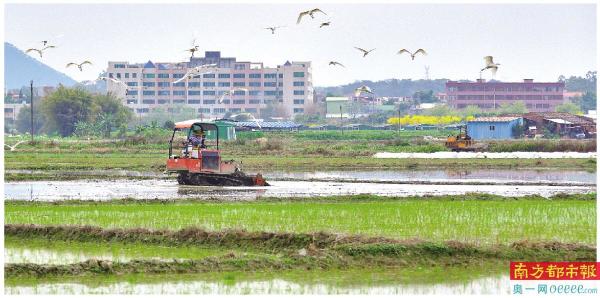 肇庆市高要区马安镇新江二村村民抓紧在雷雨到来之前犁田插秧。南都拍客 林海涛 摄