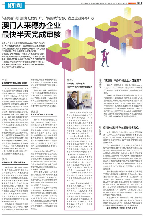 记者从广州市市场监管局获悉,从2022年3月29日起,广州将开通“穗澳通”一站式商事登记服务,创新推动开办服务前移、离岸全程电子化办理,便利澳门特别行政区申请人在穗创业投资,快捷落户广州。 3月