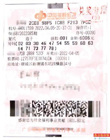 4月5日是福彩快乐8游戏第2022085期开奖,当期全国开出12注“选十中十”,单注奖金500万元。这12注“选十中十”花落广东、安徽两省,其中花落广东的11注“选十中十”全部由广州市增城区新塘镇东坑四横路45号44011599投注站的一位彩民中得,中奖彩票为一张15个号码复式自选票。由于采用复式投注,该张彩票除中得11注“选十中十”500万元外,还中得“选十中九”“选十中八”等固定奖265万多元,单票总奖金合计5765万多元。