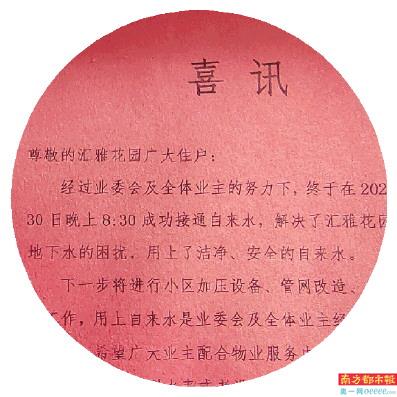 “经过业委会及全体业主的努力,终于在2021年12月30日晚上8时30分成功接通自来水,解决了汇雅花园多年来用地下水的困扰,用上了洁净、安全的自来水。”汇雅花园小区通上自来水之后,小区公告栏专门用红纸贴上了这一“喜讯”。