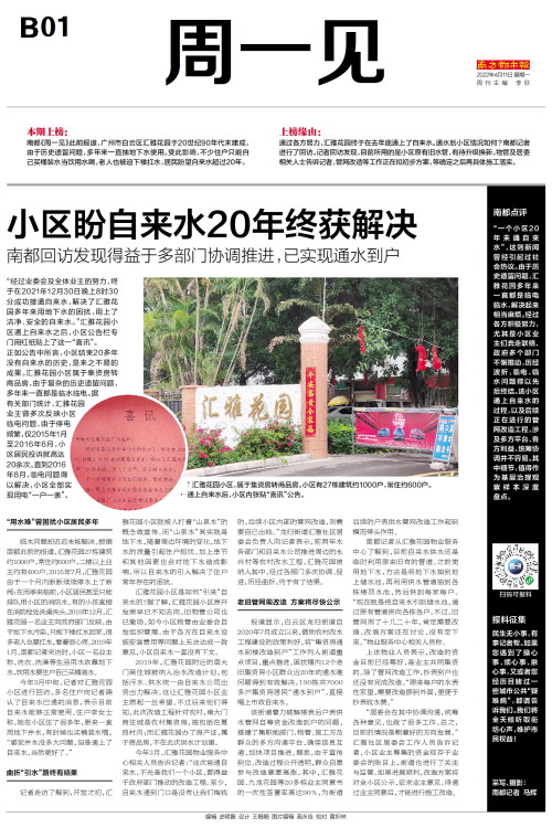 本期上榜: 南都《周一见》此前报道,广州市白云区汇雅花园于20世纪90年代末建成,由于历史遗留问题,多年来一直抽地下水使用。受此影响,不少住户只能自己买桶装水当饮用水喝,老人也被迫下楼扛水,居民