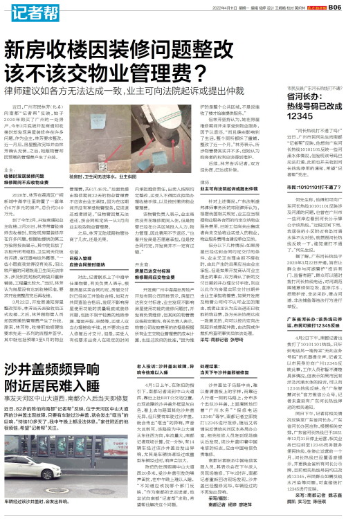 近日,广州市民林芳(化名)向南都“记者帮”反映,她于2020年购买了广州的一处房产,今年2月底被开发商通知收楼时却发现房屋装修存在许多问题。作为业主,林芳要求整改。近一月后,房屋整改完毕并由林芳确