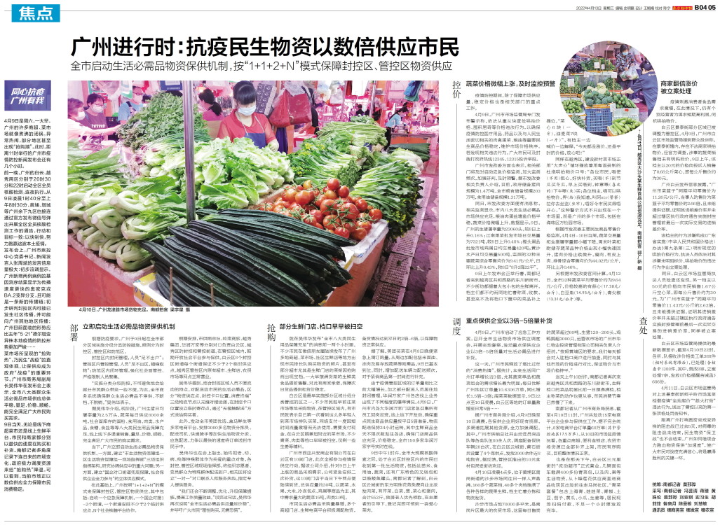 4月9日,广州市启动了应急工作方案,召开全市生活物资市场供应调度会,开展实地督察,发动重点保供应企业以3倍-5倍货量对生活必需品进行补货。