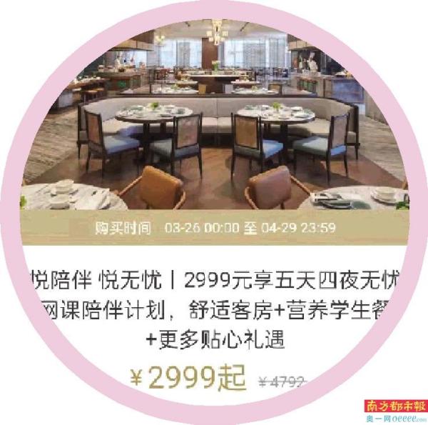 4月11日线下教学、托管机构全线暂停首日,广州高星酒店便推出一系列套餐响应“带娃”需求。广州增城凯悦酒店推出的“青少年网课陪伴计划”套餐规定,7-16岁的广州学生,在监护人陪同下入住五星级酒店大床房/双床房五天四夜,其中包含每日双人自助早餐、主厨定制学生午、晚餐营养套餐,陪同家长还可享受相应的餐饮消费优惠等。套餐定价2999元,日均近600元。