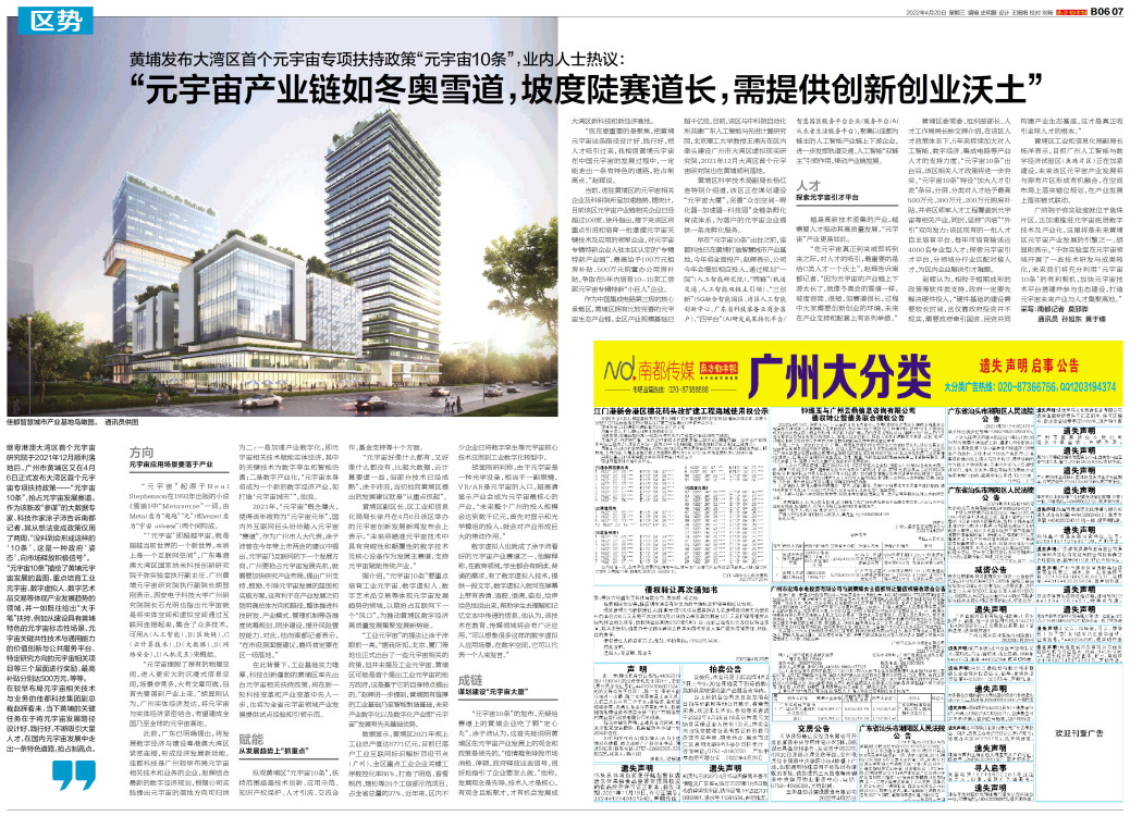 继粤港澳大湾区首个元宇宙研究院于2021年12月顺利落地后,广州市黄埔区又在4月6日正式发布大湾区首个元宇宙专项扶持政策——“元宇宙10条”,抢占元宇宙发展赛道。作为该新政“参谋”的大数据专家、科