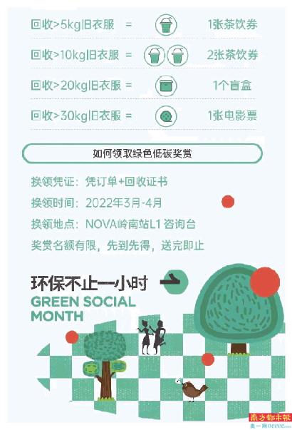 自2022年3月26日以来,佛山岭南天地推出多项绿色低碳活动,借助其会员系统,还凝聚细分了社群,打造线上、线下联动的绿色生活方式体验,如携手10家茶饮推出自带杯挑战赛;携手鸥燕回收发起“Yi吨旧衣减排行动”,凡是参与回收的市民,回收达到5kg以上即可在商场兑换电影票、萌趣盲盒、茶饮等奖赏;携手商户推出6场绿色社群活动,包括星巴克咖啡渣渣绿色臻选课堂、十如仕小纽扣大创意美学沙龙等,4月23日,还将携手95后旧物收藏家武楷斯举行“绿动天地旧物拍卖会”,甄选20+宝藏旧物,在华为授权体验店Plus岭南天地店举行一场2小时快闪式拍卖会,让更多市民体验挖宝+拍卖+收藏的乐趣,发现万物皆有的可持续生命力,活动当天市民携带数码电子类旧物产品参与回收,可现场评估获取华为焕新补贴。