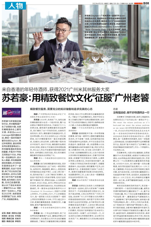 本期嘉宾 苏若豪(Dayton):广州米其林一星餐厅Rêver·玥的酒水总监、香港专业品酒师协会及国际侍酒师协会的认证侍酒师;曾获得2021广州米其林服务大奖、2018年香港专业酒侍大赛亚军、代
