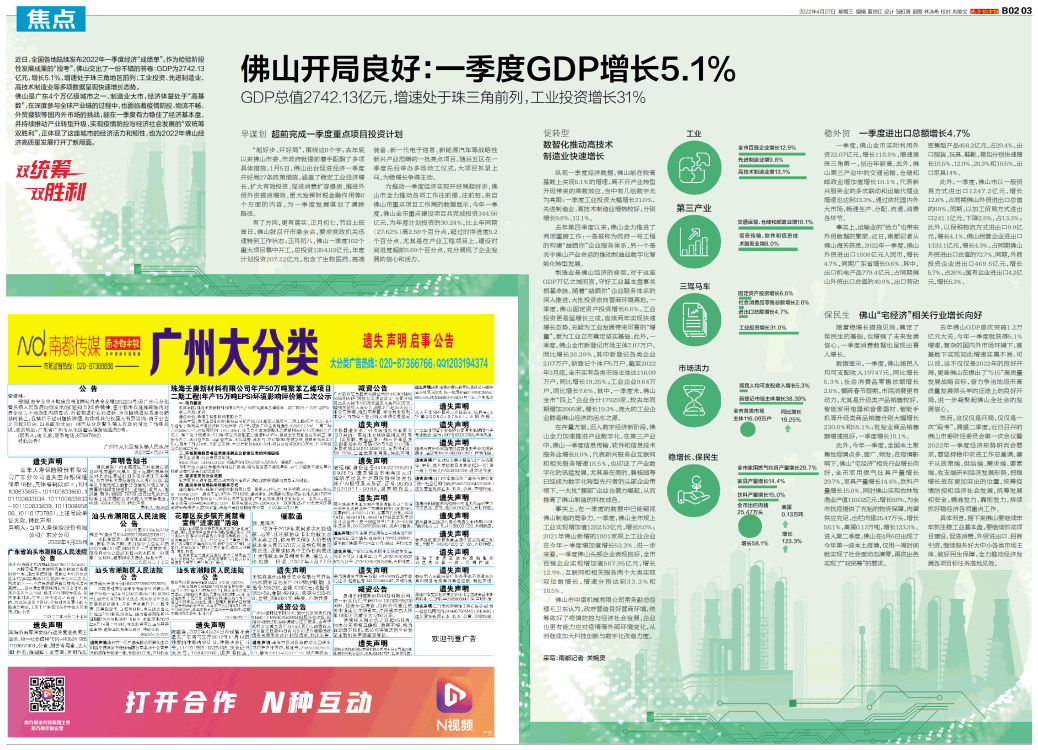 近日,全国各地陆续发布2022年一季度经济“成绩单”。作为检验阶段性发展成果的“段考”,佛山交出了一份不错的答卷:GDP为2742.13亿元,增长5.1%,增速处于珠三角地区前列;工业投资、先进制