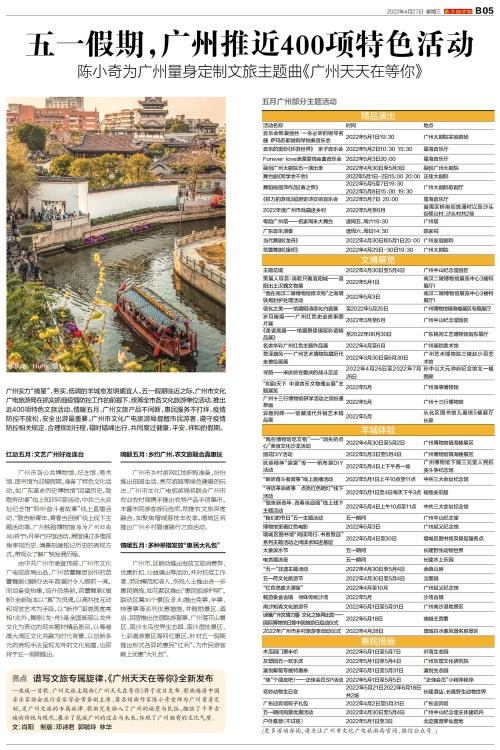 广州实力“摘星”,务实、低调的羊城愈发明媚宜人。五一假期临近之际,广州市文化广电旅游局在抓实抓细疫情防控工作的前提下,统筹全市各文化旅游单位活动,推出近400项特色文旅活动。情暖五月,广州文旅产品