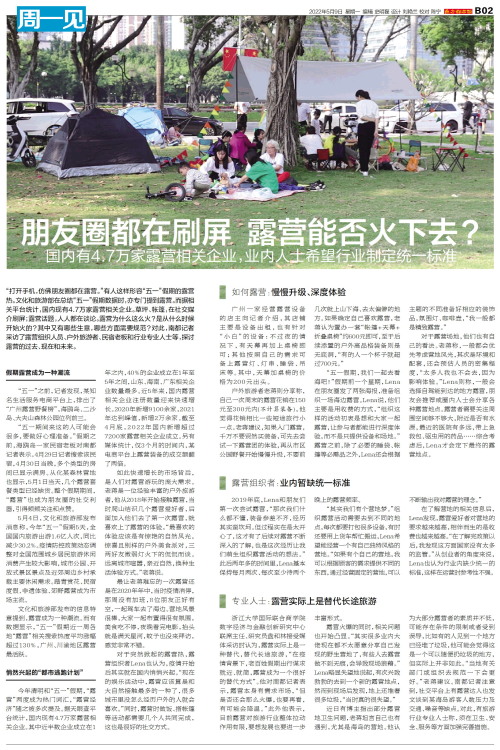 “打开手机,仿佛朋友圈都在露营。”有人这样形容“五一”假期的露营热。文化和旅游部在总结“五一”假期数据时,亦专门提到露营。而据相关平台统计,国内现有4.7万家露营相关企业。草坪、帐篷,在社交媒介刷