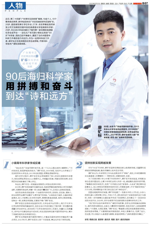 廖矿标 90后,出生于广东省河源市连平县。2013年中山大学毕业后赴美留学,2019年回广州担任生物岛实验室研究员、化学合成平台负责人。2021年5月,廖矿标成功入选广州实验室。近日,获广东