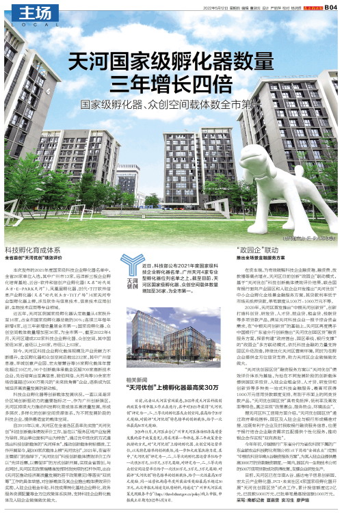 近日,科技部公布2021年度国家级科技企业孵化器名单,广州天河4家专业型孵化器位列名单之上。截至目前,天河区国家级孵化器、众创空间载体数量增加至36家,为全市第一。科技孵化育成体系全省首创“天河优