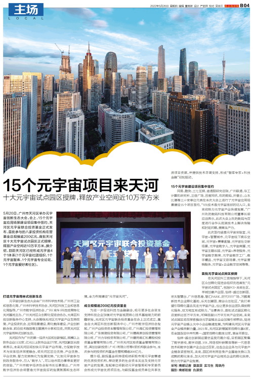 5月20日,广州市天河区举办元宇宙创新生态大会。会上,15个元宇宙应用场景建设项目集中签约,天河区元宇宙联合投资基金正式发布,首批参与的八家投资机构在管基金总规模逾200亿元。首批天河区十大元宇宙试点园区正式授牌,释放产业空间近10万平方米。据介绍,目前天河区已经形成元宇宙4个1体系(1个元宇宙社团组织,1个元宇宙智库,1个元宇宙专业论坛,1个元宇宙爱好者社区)。