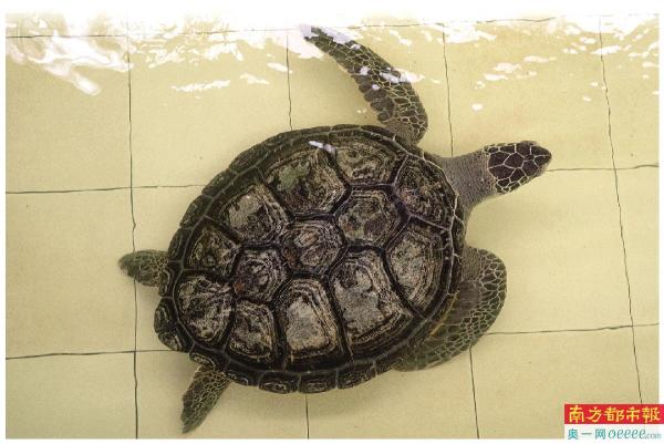 南都记者在保护基地现场看到,这只绿海龟被安置在一个正方形的海水池中,池中的海水泛着土黄色。陈敏瑶表示,海水的颜色是由于保护基地采用黄粉对海龟进行了药浴。