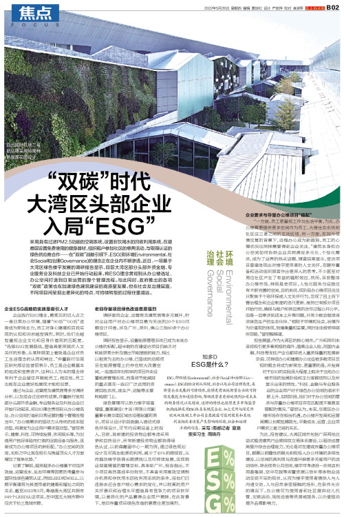 采用具有过滤PM2.5功能的空调系统,设置非饮用水的回收利用系统,在避难层设置免费使用的健身器材,组织租户参加社区的慈善活动,与取得认证的绿色供应商合作……在“双碳”战略引领下,ESG(即环境En