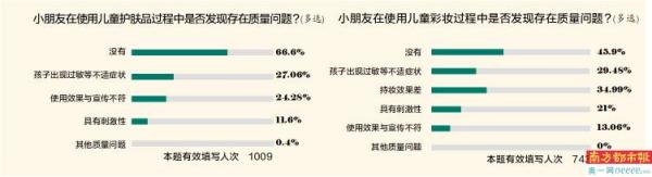 然而,在使用儿童化妆品的过程中,不少受访者也表示曾出现质量问题。有27.06%和29.48%的受访者称在使用儿童护肤品和儿童彩妆时孩子出现过敏等不适症状。还有24.28%的受访者表示买到的儿童护肤品使用效果与宣传不符,34.99%的受访者表示一些儿童彩妆持妆效果差。