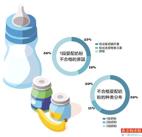 具体来看,抽检不合格的1段奶粉中,检出阪崎肠杆菌和香兰素为主要原因,占比分别达到25%和19%。其中,厦门乳企恒信乐健、湖南展辉、华威乳业以及瑞士的Holle的1段奶粉均被检测出阪崎肠杆菌。除上述原因,抽检不合格项目还包括菌落数目、镁元素、核苷酸等。