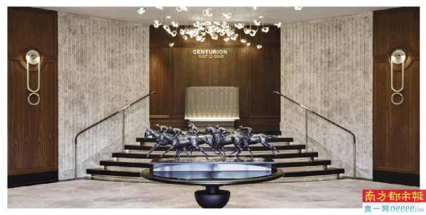 香港赛马会 设计理念:在19世纪80年代有一匹传奇名驹Rive Verdon(翠河),它的马主祈福翠河在比赛中可以好运与胜利,于是在沙田马厩上挂上铜钱。这个故事帮助我们发挥想象力,“铜钱”元素贯穿了所有餐饮和娱乐区的设计——包括灯饰、把手,甚至墙壁和地板图案。