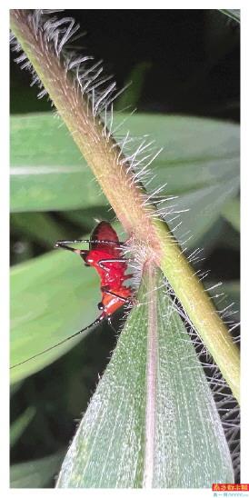一只红色的小螽斯。