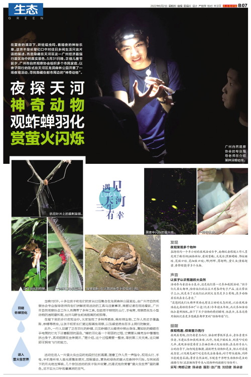 在夏夜的清凉下,听蛙唱虫鸣,看暗夜的神秘乐章。这并不是长辈们口中对往日乡间生活只言片语的描述,而是隐藏在天河区这一广州经济最强行政区当中的真实景色。5月31日晚,正值儿童节前夕,广州市自然观察协会