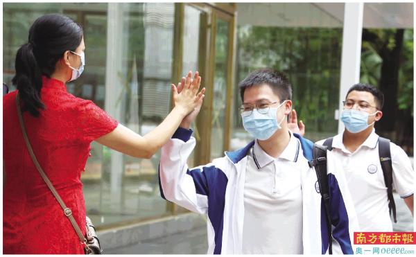 6月9日下午,广州市天河中学,结束考试的考生与老师击掌。