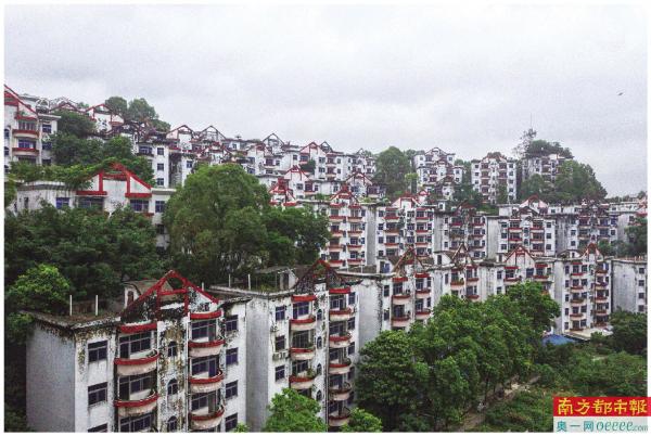 澳洲山庄依山傍水而建,烂尾多年后,小区内不少楼栋外墙已长出青苔。