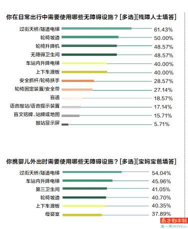 受访的宝妈宝爸中,则有54.04%表示需要使用过街天桥或隧道的升降电梯,45.96%表示需要车站内升降电梯,41.05%表示需要第三卫生间,40.70%表示需要轮椅坡道,40.35%表示需要上下车渡板,37.89%表示需要母婴室。