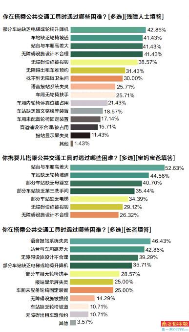 受访残障人士中,有42.86%反映部分车站缺乏电梯或轮椅升降机;其次各有41.43%表示车站缺乏轮椅坡道,站台与车厢高差大导致上下车困难,无障碍设施设计不合理难使用;同时有38.57%反映无障碍设施被损毁;31.43%表示无障碍出租车难预约;30.00%找不到无障碍卫生间。