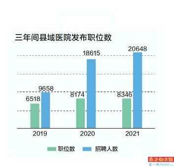 报告显示,三年间,县域医院招聘规模整体提升,县域医疗机构在丁香人才发布招聘的岗位数从2019年的6518个上升到2021年的8346个,增幅28%。招聘的总人数从9658个上升到了2万多个,增幅比较高,翻了1倍,113.8%。