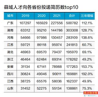 其中,广东省三年合计收到50万次投递,成为县域人才投递次数最多的省份。