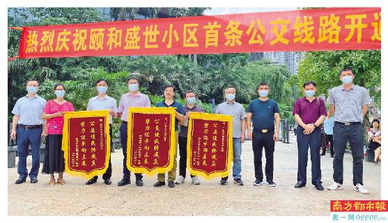 居民高先生则告诉记者,当天早上小区举行了首班通车仪式庆典,现场涌来了100多位业主,庆祝小区首次有公交线路进驻。不仅如此,全体业主还制作了锦旗、写了感谢信,在场分别致谢了广州市交通运输局、花都区交通运输局及花都区公共汽车有限公司。高先生发来的图片显示,公交站旁聚集了众多业主,正排队等着第一趟公交发出,现场十分热闹,“有业主称过年都没有那么热闹,首班车一下子坐满了。”