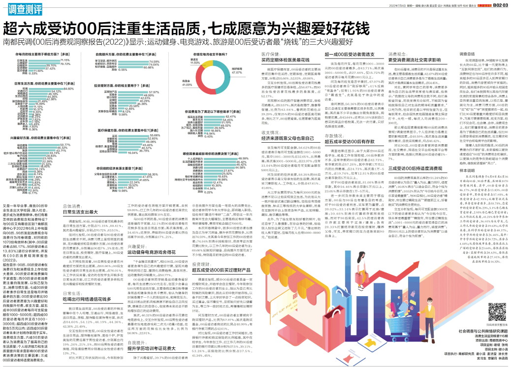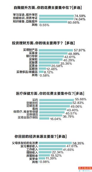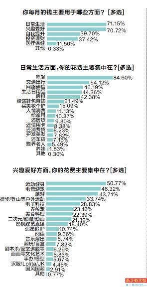 调查发现,00后、90后受访者花钱最多的是日常生活方面,分别占71.15%、80.41%,其次是兴趣爱好,分别占70.72%、63.51%。