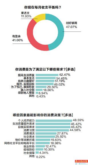 问及每月收支是否平衡时,47.07%的00后受访者表示“刚好够用”;41%反映“有盈余”;仅有11.93%的00后受访者表示“需透支”,尤其是处于待业中的受访者。