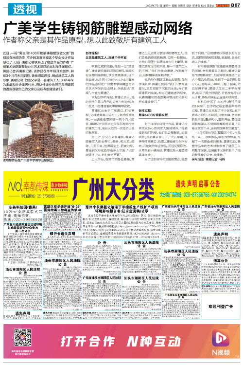 近日,一段“男生用1400斤钢筋铸雕塑致敬父亲”的视频在网络热传,不少网友直言被这个毕业设计作品感动了。日前,南都记者联系上了雕塑作品的作者:广州美术学院雕塑与公共艺术学院的本科学生黄建亿。