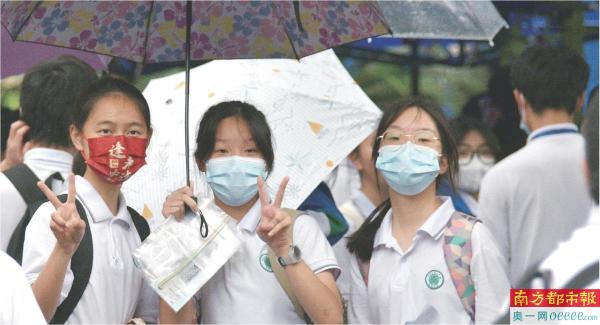 ←2022年中考,广州市第七中学考点,考生比出“胜利”的手势。南都拍客 关利生 摄