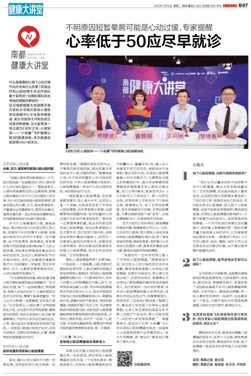 什么是健康的心跳?心动过缓不治疗会有什么危害?药物治疗和心脏起搏手术治疗相比哪个更有效?近期的黑科技无导线起搏器效果如何…… 近日南都健康大讲堂携手南方医科大学南方医院心律失常及房颤中心主任医师