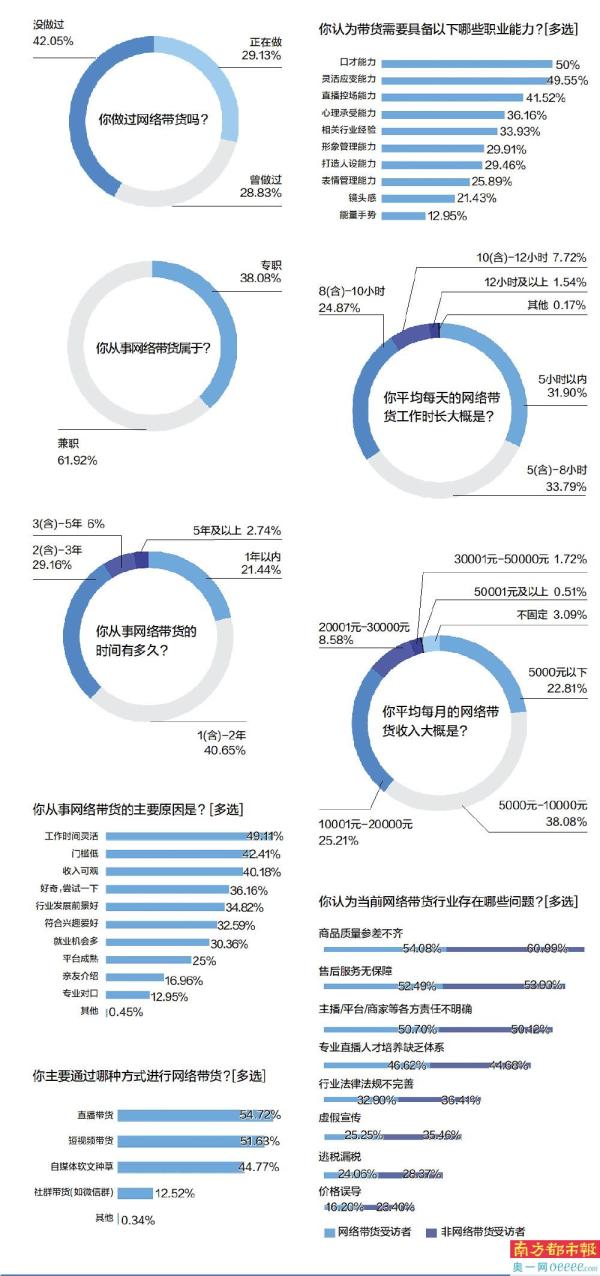 综合本次调查结果发现,大部分网络带货达人以女性、年轻群体为主,90后、95后的受访者占了六成;大部分入行做网络带货的受访者表示好奇,想体验灵活自由的工作模式。正因为不少人抱着“试一试”的心态,从事网络带货的受访者中,兼职占了六成;但兼职带货达人的收入更不稳定。在这种情况下,网络带货从业者具有“大量入、大量出”的特点。