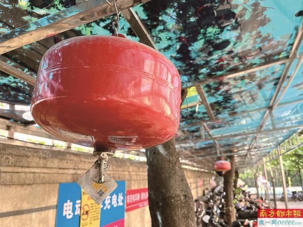 在荔湾区富力广场南区,记者见到架空层设有两台智能电动车充电柜,每台有10格供可拆卸电池充电,并设有消防栓或灭火器。海珠区嘉鸿花园小区,充电桩设置在小区西门长度约50米的单车棚内,共有34个多功能充电插头,充电插头间间隔较合理,并且棚内还设置有7个吊式干粉灭火器和2个推车式干粉灭火器,消防设备较齐全,车棚周围也安装有探头。