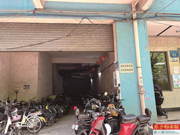 如越秀区国利大厦占用了机动车停车库边缘的一小片区域,用于停放电动车,却因小区周围空间很小,没有设置专门的电动车充电场地。