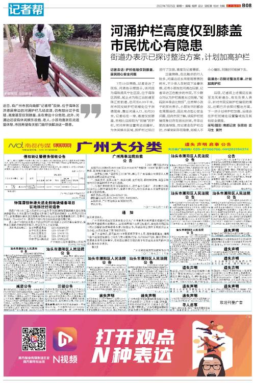 河涌护栏高度仅到膝盖 市民忧心有隐患