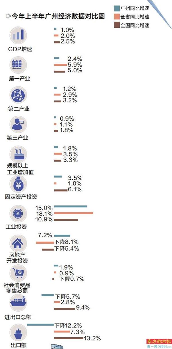 数据显示,今年上半年广州经济成绩单中工业增速和全省、全国的差距最明显:上半年广州这一数据是同比增长1.2%,而全省和全国分别是增长2.9%和增长3.2%。此外,上半年广州规模以上工业增加值同比增长1.8%,而全省和全国的数据分别是3.5%和3.3%。