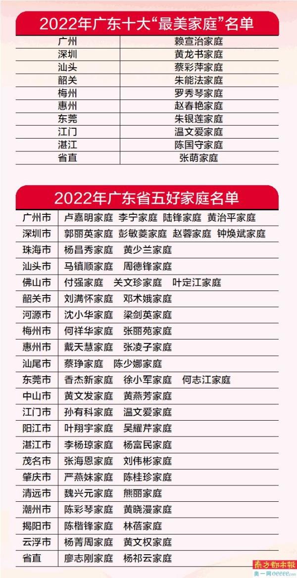 今年以来,广东省妇联联合省委宣传部、省文明办继续开展寻找“最美家庭”活动,引导群众传承家庭美德,讲好最美家庭故事。最终,分别来自广州、深圳、汕头、韶关、梅州、惠州、东莞、江门、湛江9市和省直机关单位的10个家庭入选2022年广东十大“最美家庭”。