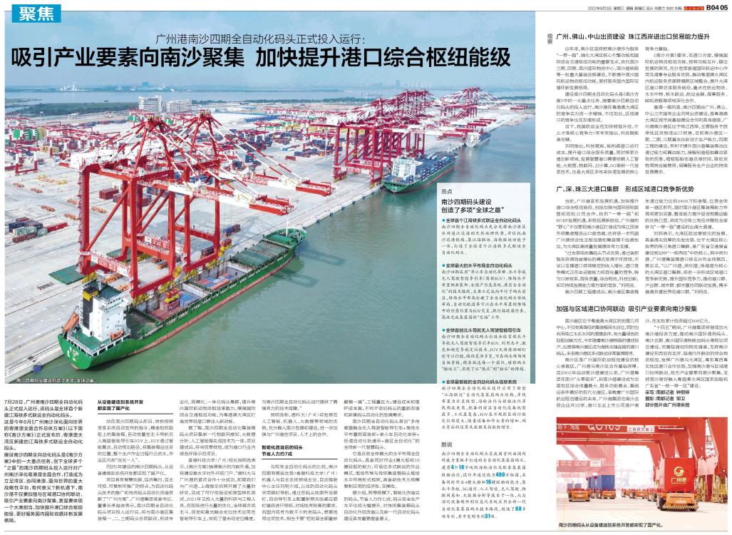 7月28日,广州港南沙四期全自动化码头正式投入运行。该码头是全球首个新建江海铁多式联运全自动化码头。 这是今年6月《广州南沙深化面向世界的粤港澳全面合作总体方案》(以下简称《南沙方案》)正式发布