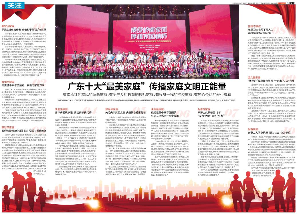 今年揭晓的广东十大“最美家庭”中,有传承红色家风的革命家庭,有坚守乡村教育的教师家庭,有投身一线的抗疫家庭,有热心公益的爱心家庭。这些最美家庭典型,以实际行动传播家庭文明正能量,为广