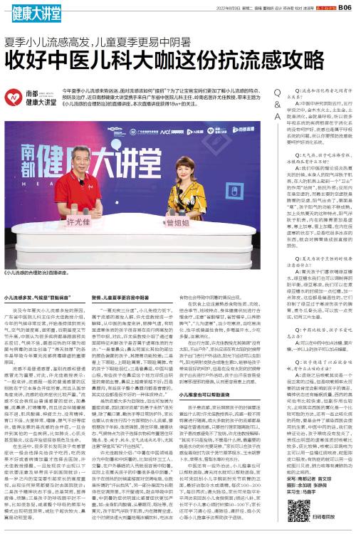 今年夏季小儿流感来势汹汹,面对流感该如何“接招”?为了让宝爸宝妈们更加了解小儿流感的特点、预防及治疗,近日南都健康大讲堂携手来自广东省中医院儿科主任、岭南名医许尤佳教授,带来主题为《小儿流感的合理