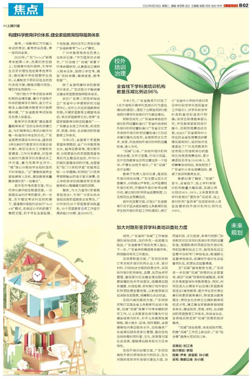 2021年7月24日,“双减”政策发令枪响。为力争交出让群众满意的“双减”答卷,广东立即行动、多措并举,在这场让教育回归育人本质的变革中,书写着属于“广东答案”。校内提质增效方面,全省100%义务教育学校建立校内作业公示制度,100%学校落实了作业管理“压总量、控时间”要求;课后服务方面,已基本达到义务教育学校全覆盖和有需求的学生全覆盖;校外机构治理方面,全省线下、线上学科类培训机构压减比例分别达96%、86%……