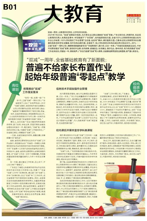 双减一周年,让教育回归学校,让学生回归校园。 2021年7月24日,“双减”政策发令枪响。为力争交出让群众满意的“双减”答卷,广东立即行动、多措并举,在这场让教育回归育人本质的变革中,书写着